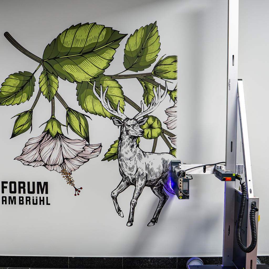 WallPen est une technologie d’impression verticale directe sur murs, développée et fabriquée en Allemagne depuis 2017. Cette machine imprime des motifs, logos ou visuels en grand format directement sur des surfaces verticales (murs, façades, plâtre, bois, verre, béton, etc.) avec une grande précision et durabilité, grâce à une technologie UV avancée.